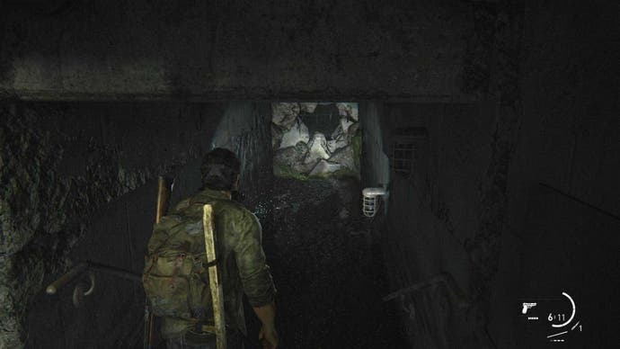 Ellie와 함께 계속 앞으로 나아가면서 길을 따라 보이는 모든 보급품을 집으세요. 왼쪽 계단을 내려간 다음 오른쪽 계단을 타고 터널을 지나 다음 세트로 올라갑니다. 이 좁은 복도를 따라 계속 가십시오.