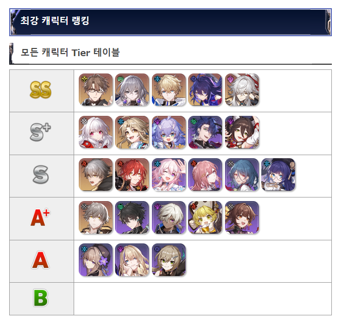 모든 캐릭터 Tier 테이블