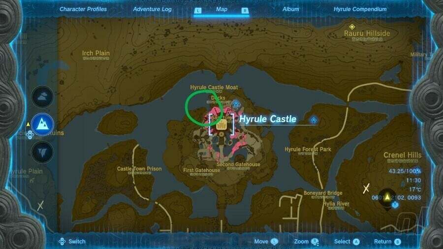 부두로 가는 가장 쉬운 경로는 Irch Plain 주변 어딘가에 있는 Hyrule Castle의 북쪽으로 향하는 것입니다 . 그런 다음 Purah Pad 지도에서 아래에 녹색으로 표시된 성의 북서쪽에 있는 물의 구멍을 찾으려고 합니다 .