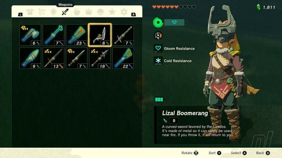 인벤토리로 이동하기 전에 컨트롤러의 "R" 버튼을 길게 누릅니다 . 무기를 들고 있는 경우 Link는 이제 무기를 던질 준비를 합니다. 따라서 특정 무기를 던질 의도가 있는 경우 버튼에서 손을 떼면 발사됩니다.