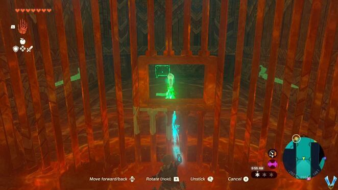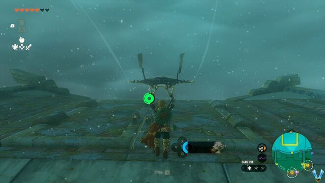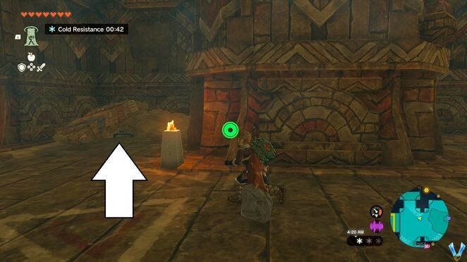 동쪽으로 가는 작은 길(막다른 골목)을 무시하고 대신 남쪽으로 향하여 바닥에 있는 구멍을 찾으십시오. Ascend 기능을 사용하여 근처의 아치 꼭대기에 도달하고 활공하여 다른 절반 수준을 찾으십시오. Ultrahand를 사용하여 뒤집고 이전에 봉인된 입구를 엽니다. 정돈된.