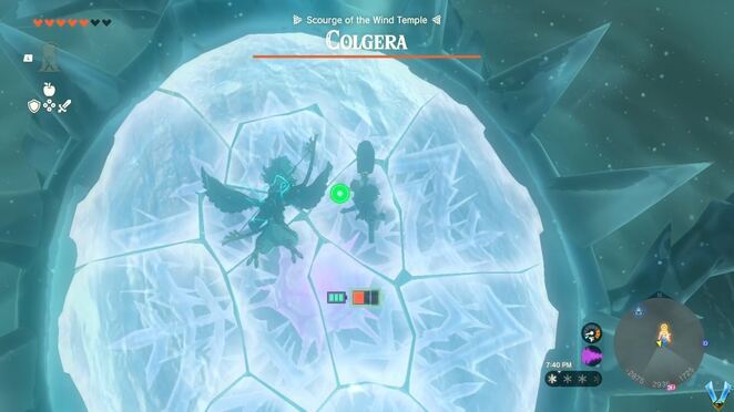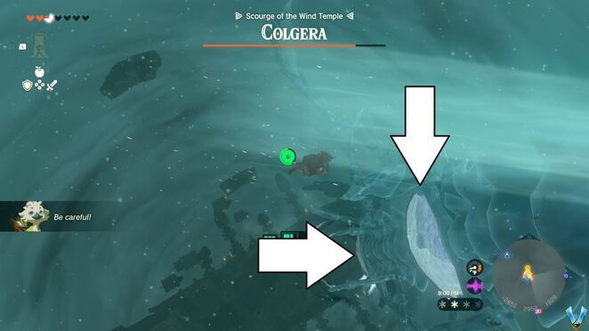 이것이 보스의 약점이지만 그가 발견할 때까지 기다려야 합니다. 대부분의 경우 Colgera는 꿈틀거리기 시작할 때까지 그냥 날아다닐 것입니다. 이런 일이 발생하면 그의 약점 중 하나가 드러나지 않는지 그를 살펴보십시오. 이것은 그가 당신을 향해 위쪽으로 스파이크를 쏘기 시작하기 때문입니다. 그들을 피하기 위해 여기로 다이빙하고 가까이 다가가면 약점을 3번 쏘아 파괴하고 싶을 것입니다. Fire Fruits 또는 Bombs를 화살에 융합하지 마십시오. 그들은 더 많은 피해를 입히지 않습니다.