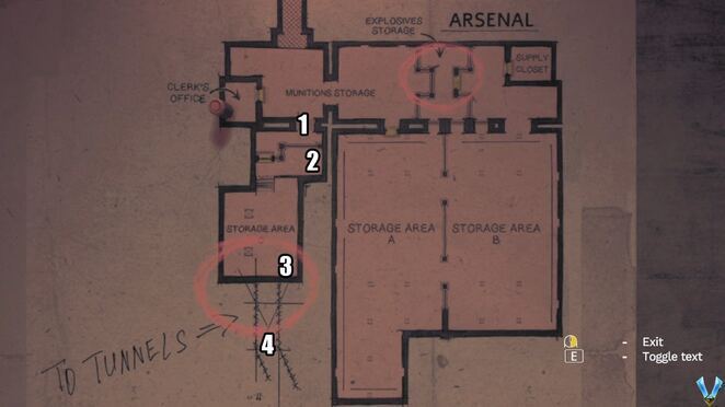 옆방 Reynard의 방 은 수류탄으로 열 수 있으며 오른쪽 에는 NOTE - In Charge of Security가 있고 NOTE - Assumptions About Motive는 책상 서랍 안에 있습니다.