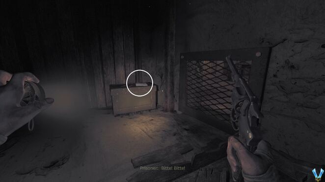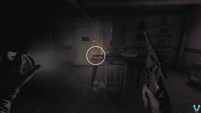 문을 열고 안으로 들어갑니다. 여기에서 선반을 확인하여 권총에 사용할 총알을 찾으십시오. 3개가 있습니다(각 상자에는 글머리기호 1개만 있음). 계속해서 그것들을 집어들면 재장전하는 방법을 배우게 될 것입니다.