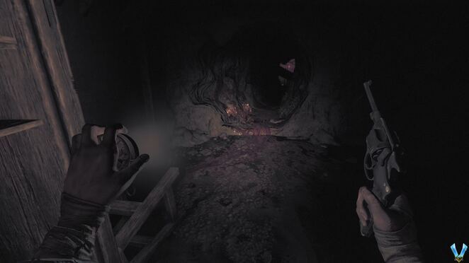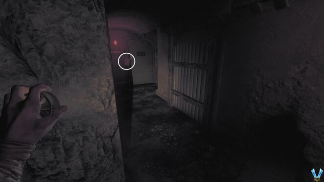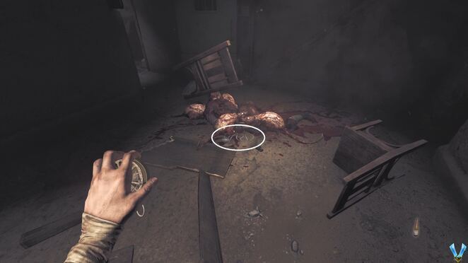 문을 통해 Delisle의 방을 나가면 분기점에 있게 됩니다. 왼쪽으로 가면 리볼버를 얻은 시작점으로 이동합니다. 이 문은 이전에 잠겨 있었으므로 잠금을 해제하고 두 영역을 연결할 수 있습니다. 하지만 직진도 가능합니다. 지상에 인계철선이 있어 점프할 수 있으며 계단을 내려가면 DOG TAG (10)가 있는 시체가 있습니다.