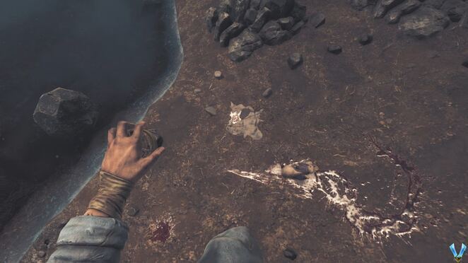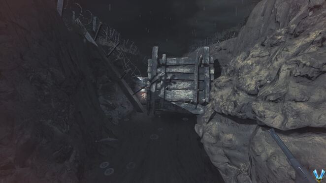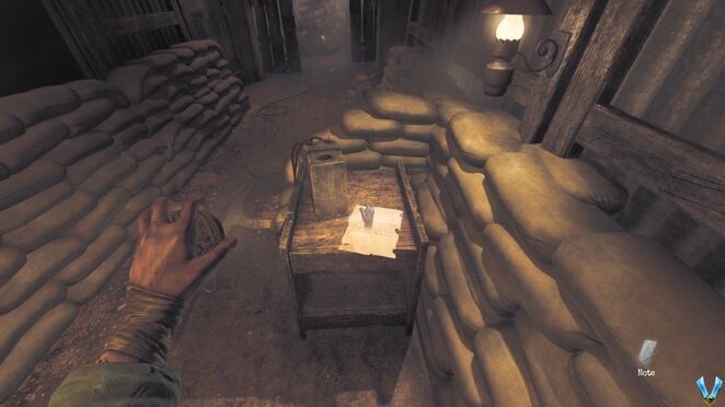 문을 부수려면 벽돌을 두 번 던져야 합니다. 그렇게하고 앞으로 오른쪽으로 가십시오. 결국 판자 몇 개를 옮기고 나무 잔해 아래에 웅크려야 합니다. 총알 하나를 찾으려면 분기점으로 바로 이동하십시오. 그것을 잡고 원한다면 재장전하고 참호 아래로 계속 내려가면 일부 적의 공격을 받게 될 것입니다. 너무 많은 피해를 입지 않도록 최대한 빨리 모래주머니 뒤에 엄폐하는 것이 좋습니다(실제로 중요한 것은 아닙니다).