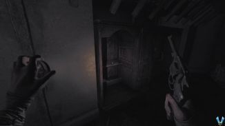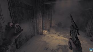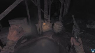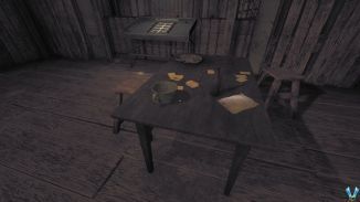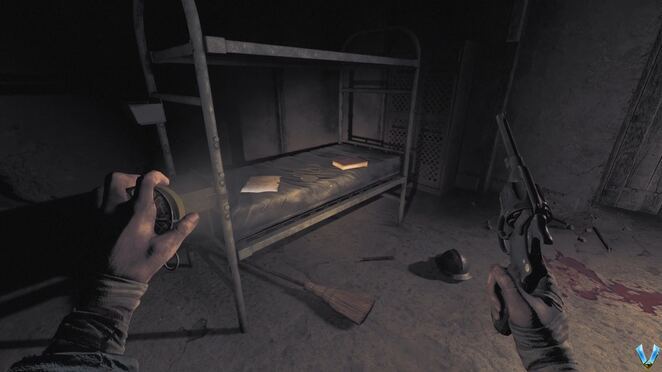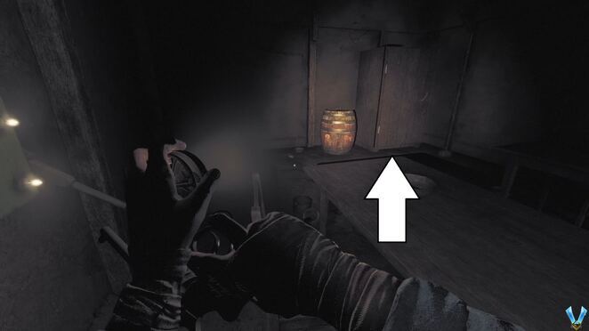 돌아다니며 몸을 웅크리고 탁자 아래로 가면 선반 위에 수류탄 두 개가 놓여 있습니다. 그것들을 집어 들고 인벤토리를 통해 장비하고 마지막에 있는 나무 문에 그 중 하나를 던져야 합니다. 그렇게하고 멀리 이동하여 날려 버리십시오.
