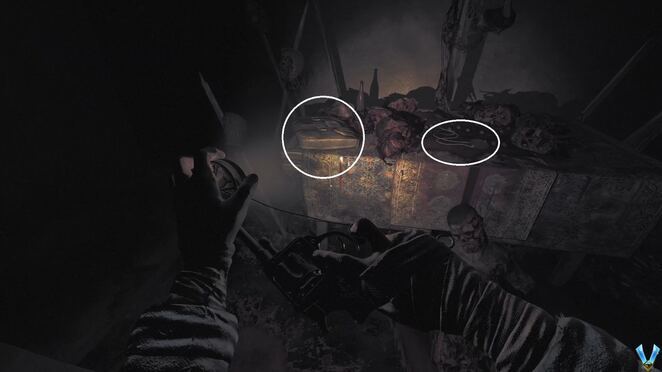 계속해서 다음 벙커 안으로 들어가십시오. 여기 테이블에서 두 개의 천을 찾을 수 있습니다.