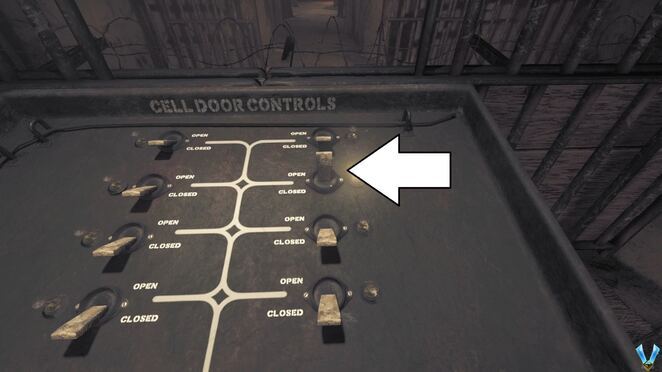 잠긴 문(7)으로 이동하여 통신실 (11) 로 계단을 올라갑니다 . 여기서 스위치를 아래로 내리고 NOTE-Farber Dies를 잡습니다 .