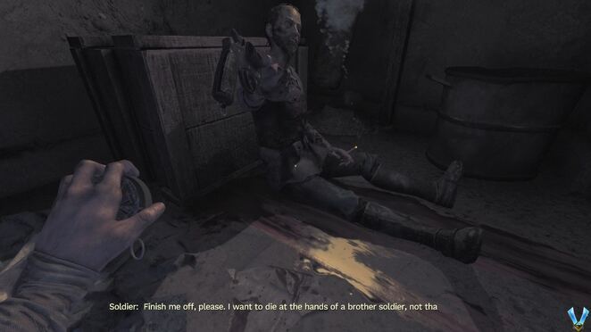 우리는 제1차 세계 대전 중 전장의 참호에서 게임을 시작합니다. 여기에는 아직 적이 없으므로 이 시간을 사용하여 컨트롤에 익숙해집니다. 이동하면서 로 무기를 꺼내는 방법에 대해 들은