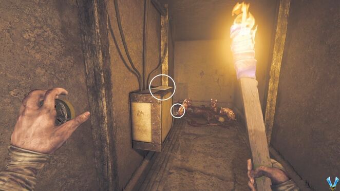 지도 옆에는 발전기실로 가는 계단이 있습니다. 거기에 가기 전에 오른쪽을 확인하여 벽에 있는 찬장을 찾으십시오. 그 아래 테이블에는 쥐와 불에 탄 시체가 있습니다 .