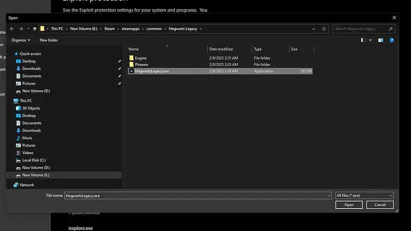 그런 다음 PC에 설치된 디렉토리에서 Hogwarts Legacy 실행 파일을 선택합니다. Steam 사용자 의 경우 기본 경로는 C:\Program Files\Steam\steamapps\common\Hogwarts Legacy 입니다 .