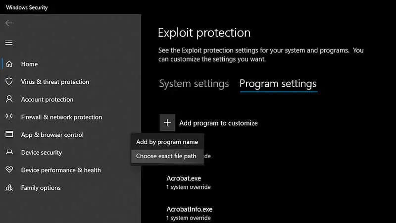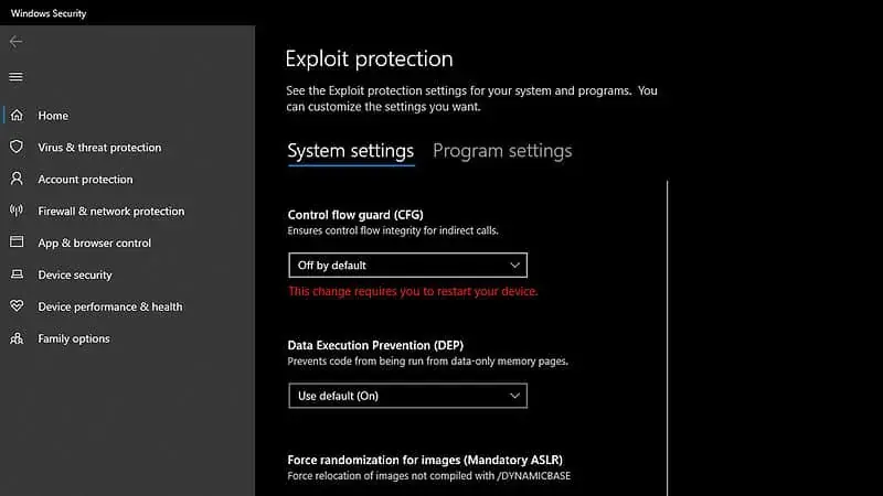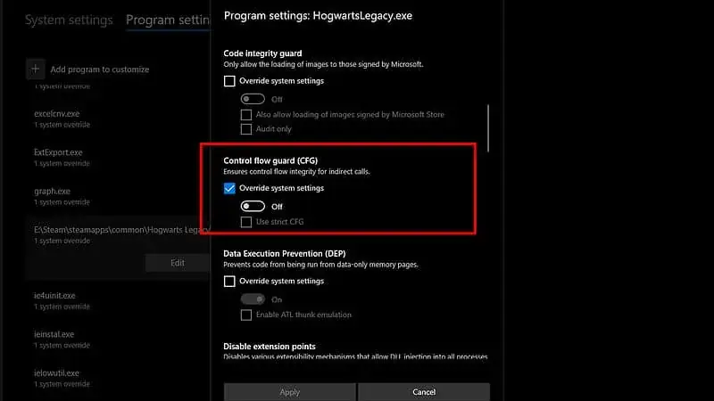 선택하면 새 창이 나타납니다. 'CFC(Control Flow Guard)'가 보일 때까지 아래로 스크롤하고 '시스템 설정 재정의'를 선택합니다. 그런 다음 토글 버튼을 '끄십시오'.