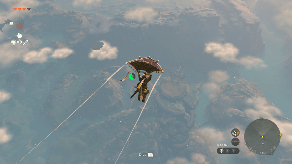 링 게임은 잠수식으로 알려져 있으며 링크는 용기 섬을 완성하기 위해 그것을 끝내야 합니다. 시작하려면 Zonai 충전 1회가 필요하며 시간 제한이 있습니다. 그는 35초 이내에 6개의 고리를 모두 통과해야 합니다. 하나의 링을 놓치면 실패로 간주됩니다. 이제 글라이더를 사용하여 각도를 조정하고 해당 RB를 눌러 시간이 부족하지 않도록 더 빠르게 다이빙할 수 있습니다! 나는 첫 번째 하강을 위해 글라이더로 세 번만 다이빙하고 각도를 조정했습니다.