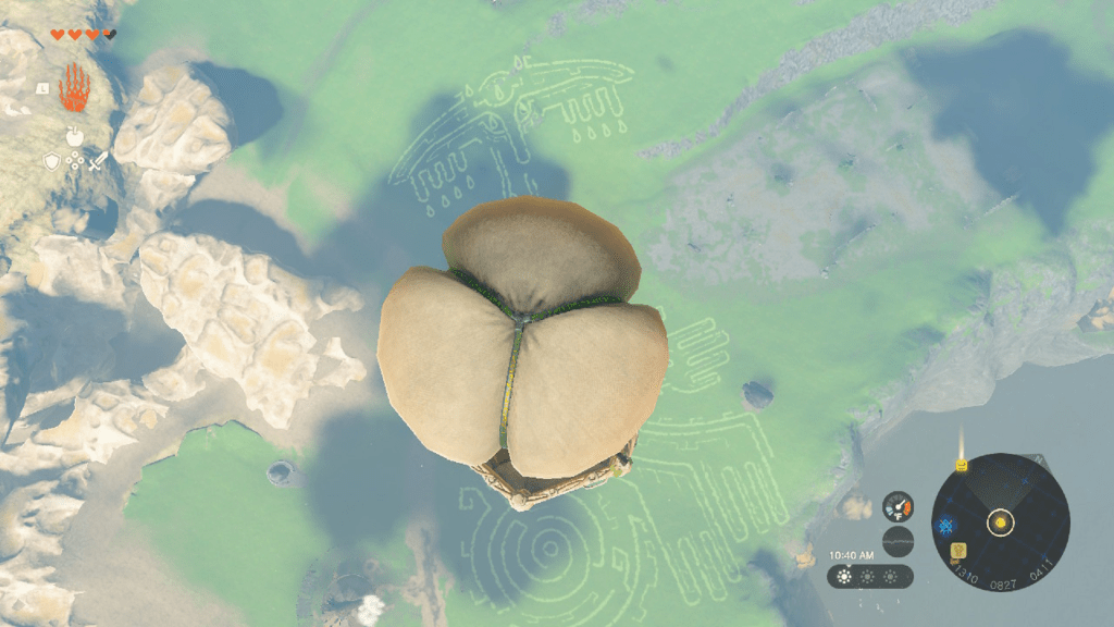 임파가 그곳에서 기다리고 있고, 그녀의 열기구가 부러지기 전에 높은 곳에서 보려고 했던 지상 그림이 주위에 있다는 것을 인정합니다. Ultrahand 기술을 사용하여 풍선을 집어 베이스에 다시 부착합니다. 이후 임파에게 말을 걸면 그녀가 우주선에 탑승할 것입니다. 조심하세요. 먼저 풍선 아래에 있는 나무에 불을 붙이면 노인 승객 없이 풍선이 이륙하고 게임은 실수하기 직전에 재장전하도록 강제할 것입니다! 임파가 안전하게 서 있으면 나무에 불을 붙인 다음 임파와 함께 위로 날아갑니다. 아래에 선명한 이미지가 있지만 그녀는 거대한 이미지에 대한 추가 정보를 제공하는 누락된 부분을 파악할 수 없습니다.