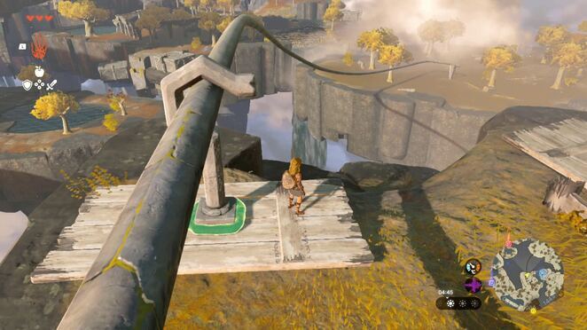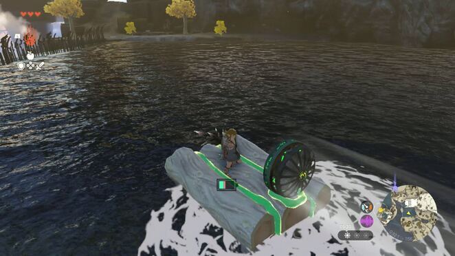 이 위치에서 우리는 호수를 건너기 위해 또 다른 배를 만들어야 합니다. 이번에는 근처에 돛이 없을 것입니다. 대신 지상에 있는 팬 중 하나를 집어 뗏목에 부착하고 싶을 것입니다. 이 팬 중 하나를 누르면 켜지고 다시 누르면 꺼집니다. Link의 Energy Cell이 충전되어 있는 한 충전되어 작동합니다.
