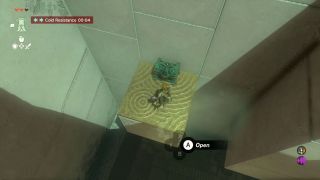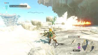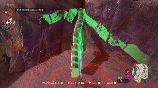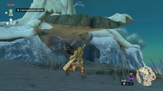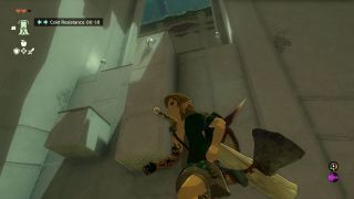 경로의 분할로 돌아가서 계속 진행하십시오. 동굴 밖으로 나가는 길을 찾을 때까지 연속적으로 더 높은 선반을 계속 올라갑니다. 이 시점에서 날씨가 시작되고 Link가 떨리기 시작합니다. 인벤토리의 '음식' 탭으로 이동하여 이전에 요리한 음식을 먹어 달콤하고 달콤한 내한성을 얻으세요.