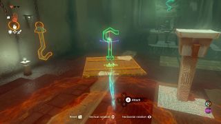 Ultrahand가 활성화된 상태에서 이 기능을 사용하여 조작할 수 있는 개체는 주황색으로 강조 표시되고 Link의 대상이 되는 동안 개체는 녹색으로 변경됩니다.