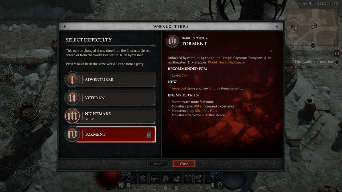 레벨 50에 도달하면 악몽 난이도인 월드 티어 3에 가입할 수 있습니다. 일반적으로 이 난이도에 도달하면 전설 획득률이 높아집니다. 악몽 난이도는 Helltide 이벤트 에 참여할 수 있는 능력도 부여합니다 . 궁극적인 목표가 Legendaries를 찾는 것이라면 여기에서 World Tier를 전환하고 싶을 것입니다.