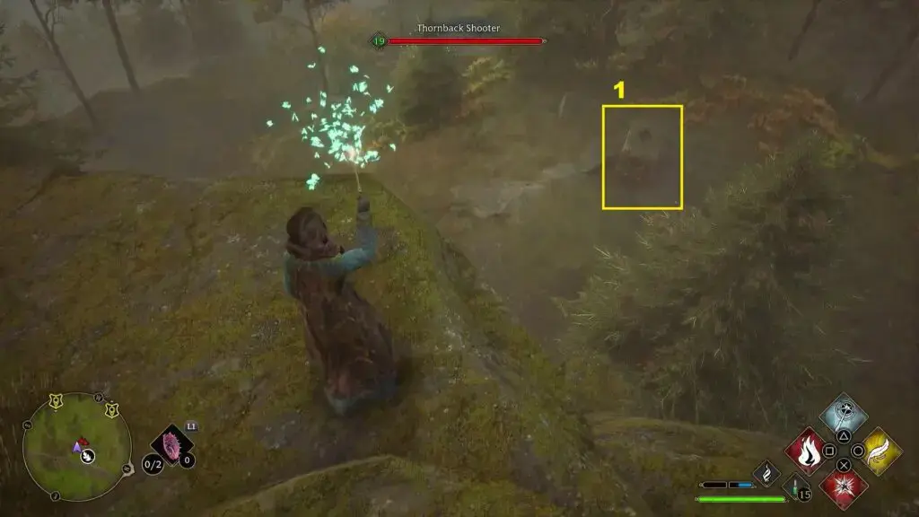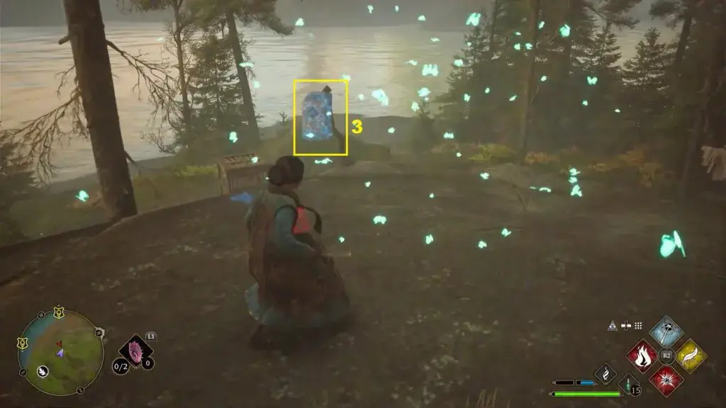 당아욱을 사용한 후 주변 지역에 3개의 거대한 돌기둥이 활성화됩니다. 거대한 돌에는 달빛의 보석이 들어 있습니다. 또한 아래 두 번째 그림과 같이 해당 지역에서 나비 무리를 찾을 수 있습니다. 나비 근처로 가서 Lumos 주문을 사용하면 나비가 당신을 따라오게 됩니다. 불을 밝힐 거대한 돌기둥으로 가져가세요. 3개의 거대한 돌기둥에 불을 붙여 멀린 시험을 완료하세요. 나비 무리와 돌 중 하나가 해안 근처에 있습니다. 찾을 수 없는 경우 Revelio를 사용하십시오 .