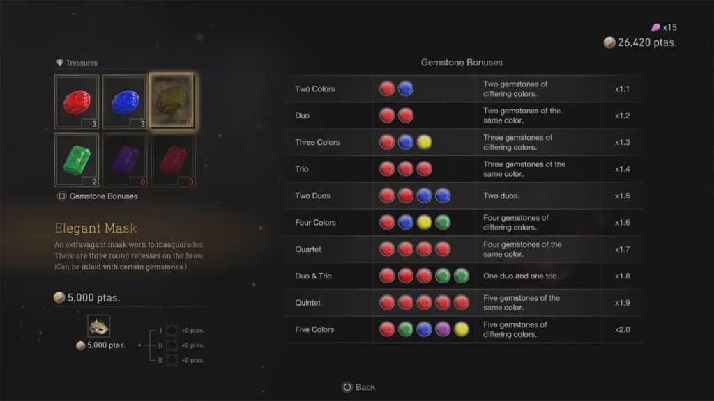할 수 있는 가장 가치 있는 조합은 사파이어 , 옐로우 다이아몬드 , 에메랄드 , 알렉산드라이트 및 레드 베릴을 사용하여 다섯 가지 색상 조합을 갖는 우아한 왕관을 사용하는 것입니다 . 이 조합은 각 항목을 개별적으로 50,000페세타에 판매하는 것과 비교하여 총 가치가 100,000페세타입니다.