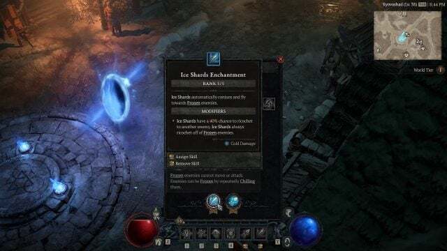 군중 제어 및 DPS를 더욱 향상시키려면 먼저 인챈트 슬롯에 얼음 조각을 할당하여 얼어붙은 적을 대상으로 지정해야 합니다. 다음으로 Frozen Orb를 사용하여 자동으로 캐스팅하고 AoE 기능을 증폭하는 것을 잊지 마십시오.