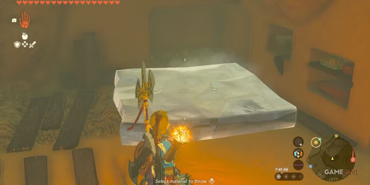 플레이어에게 Fire Fruit 또는 Red Chuchu Jelly가 없는 경우 Zonai Flame Emitter를 사용하거나 Ruby를 무기 에 융합할 수 있습니다 . Flame Emitter 또는 Ruby를 사용하면 Fire Fruit보다 얼음이 훨씬 빨리 녹습니다 . 루비를 사용하는 분들은 루비를 장착 하고 얼음 옆에 서서 천천히 녹이세요. Link가 얼음을 완전히 녹이면 처음부터 다시 시작해야 합니다.