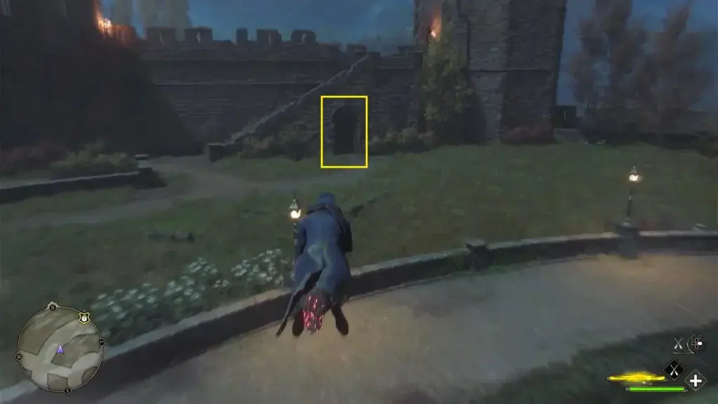 아래 그림에 표시된 위치에서 남쪽 날개로 들어갑니다. 그런 다음 계속 진행하여 Gryffindor Tower로 가십시오. 아래 두 번째 그림과 같이 레벨 1 잠긴 문이 있습니다. 문을 열고 안으로 들어갑니다. 그런 다음 중앙에 있는 마구간으로 들어가 데미가이즈 동상을 찾으십시오 .