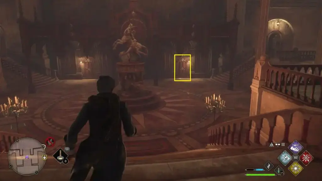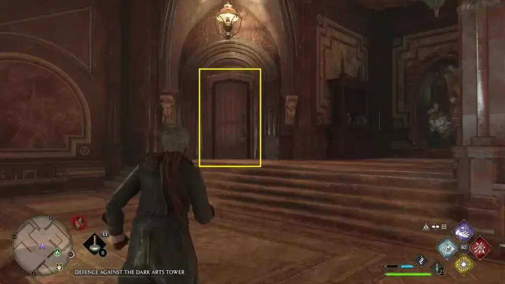 Potions Classroom Floo Flame 옆의 문을 통과하십시오. 그런 다음 아래 두 번째 그림과 같이 계단을 내려가 레벨 1의 잠긴 문에 도달합니다. 복도를 따라 내려가 왼쪽에 있는 레벨 2 문을 열면 그 뒤에 있는 데미가이즈 조각상을 찾을 수 있습니다.