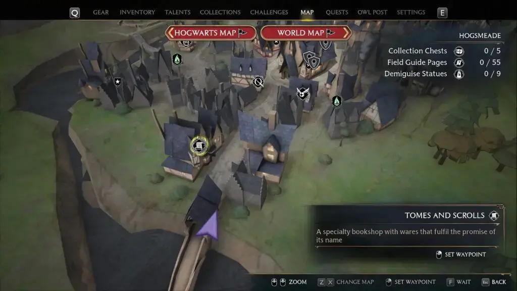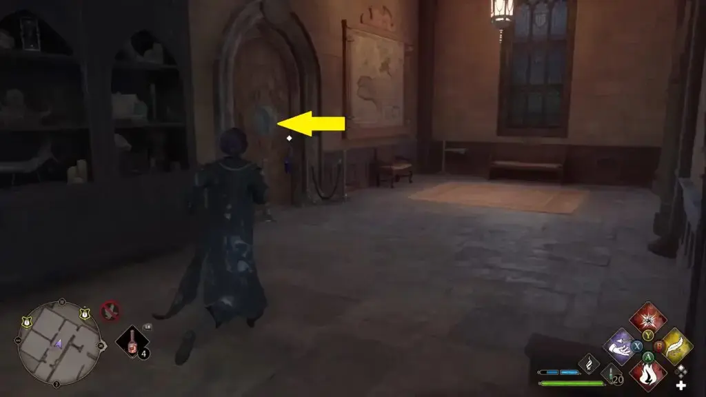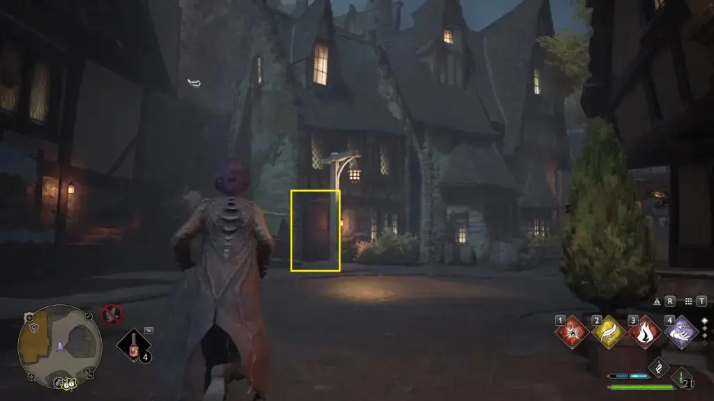 아래 그림과 같이 West Hogsmeade Floo Flame 앞에 있는 레벨 2 잠긴 문을 열고 집으로 들어갑니다. 그런 다음 위층으로 이동하여 동상을 찾으십시오.