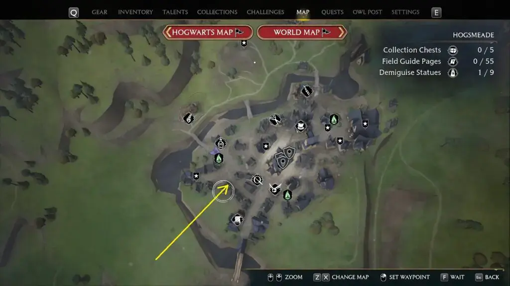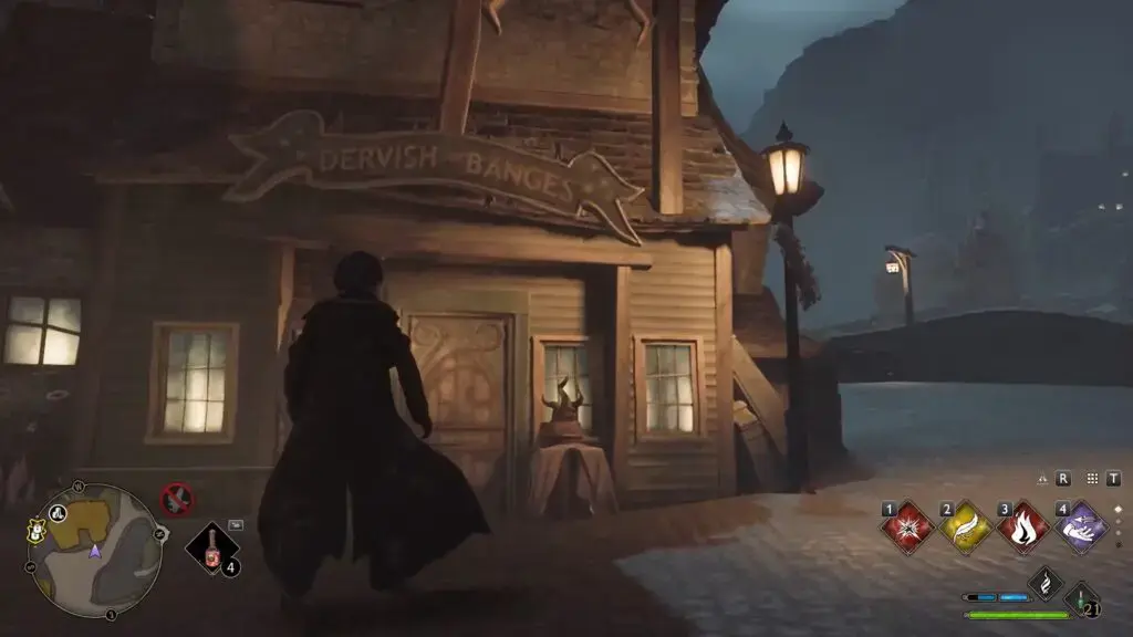 North Hogsmeade Floo Flame에서 북서쪽으로 이동하여 아래 그림과 같이 Dervish와 Banges로 들어가 조각상을 얻으십시오.