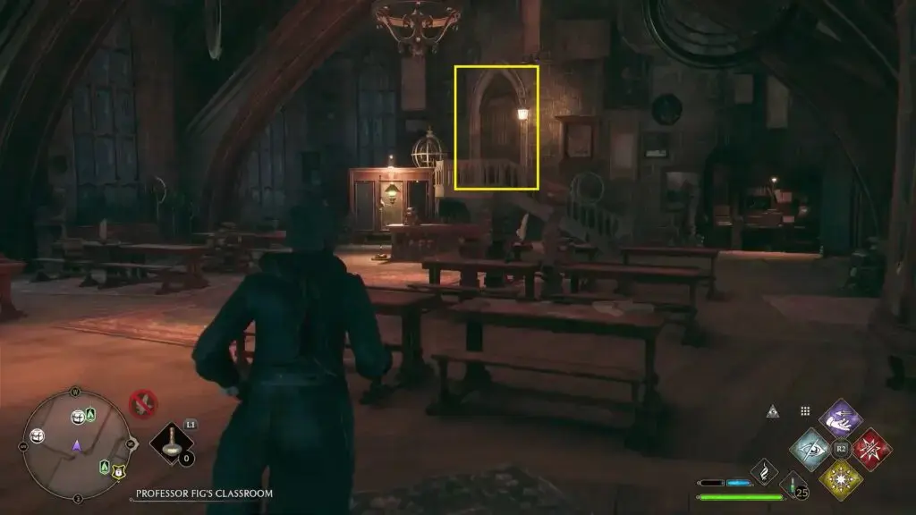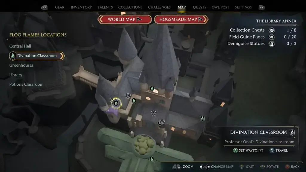 점술교실 플루플레임 옆 계단을 올라갑니다. 그런 다음 그곳에서 사다리를 타고 점술 교실에 도달하면 데미가이즈 조각상을 찾을 수 있습니다 .