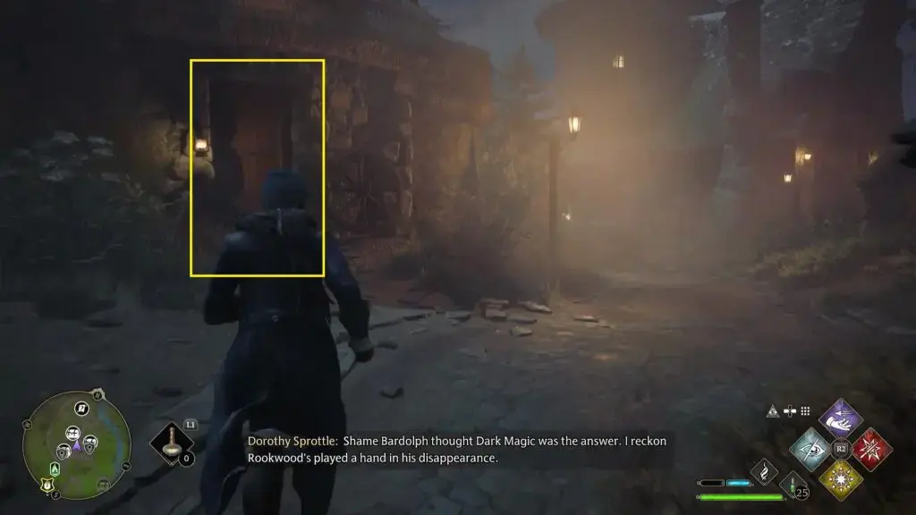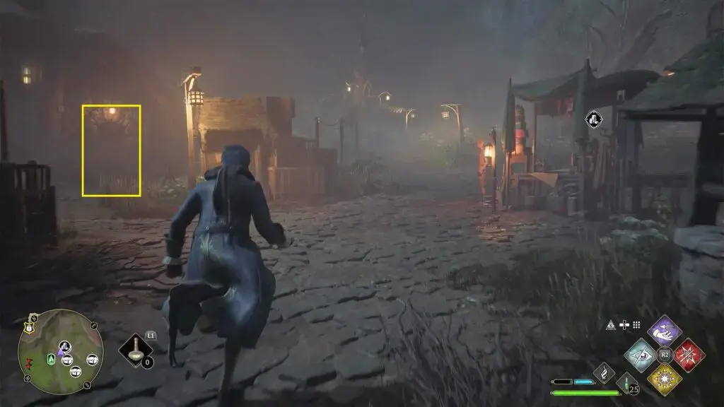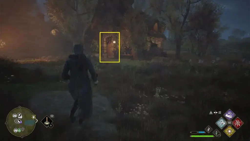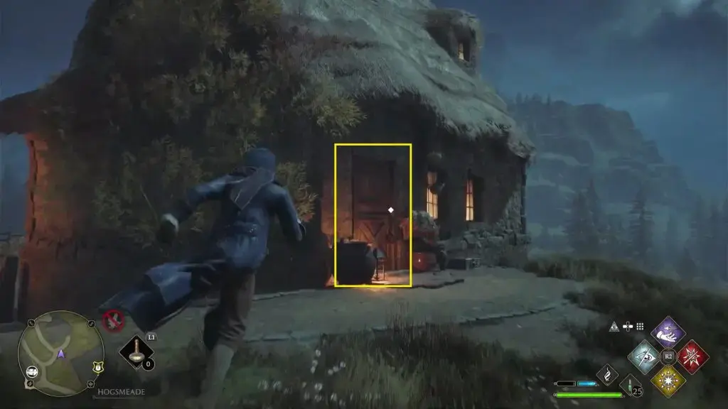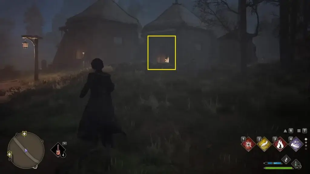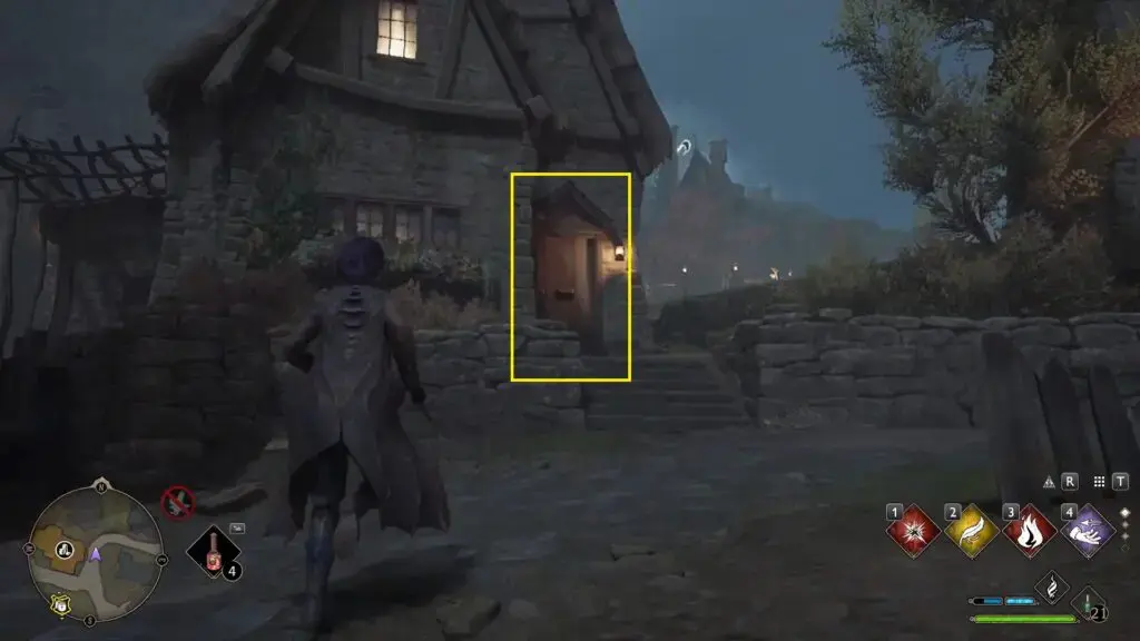 아래 그림과 같이 North Hogsmeade Floo Flame의 북쪽에 있는 집으로 들어가려면 레벨 1 자물쇠를 열고 조각상을 찾으세요.