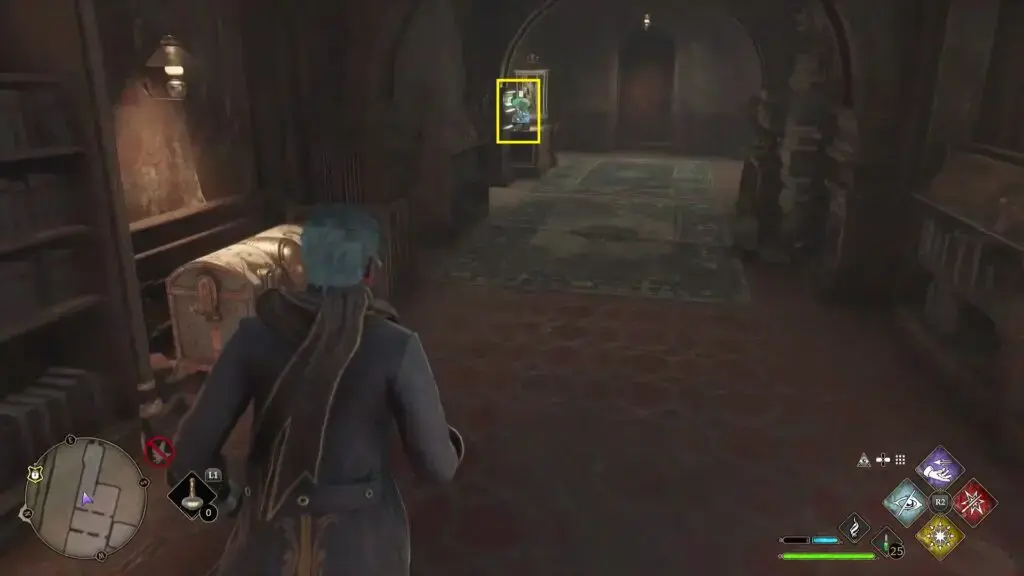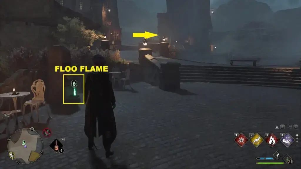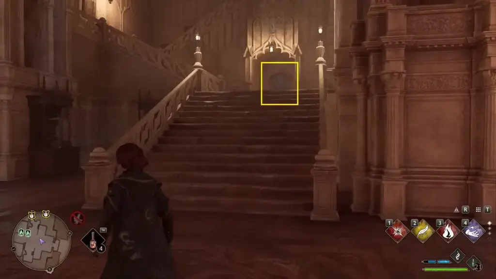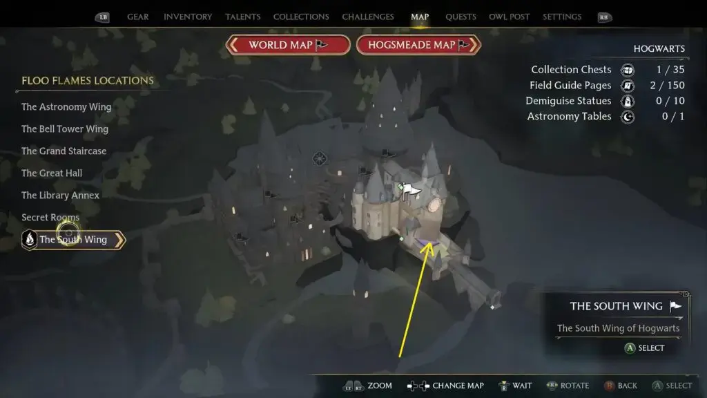 South Hogsmeade Floo Flame에서 북쪽으로 이동하여 아래 그림과 같이 오른쪽에 있는 레벨 1 잠긴 문을 엽니다. 그런 다음 계단을 올라가 동상을 찾으십시오.