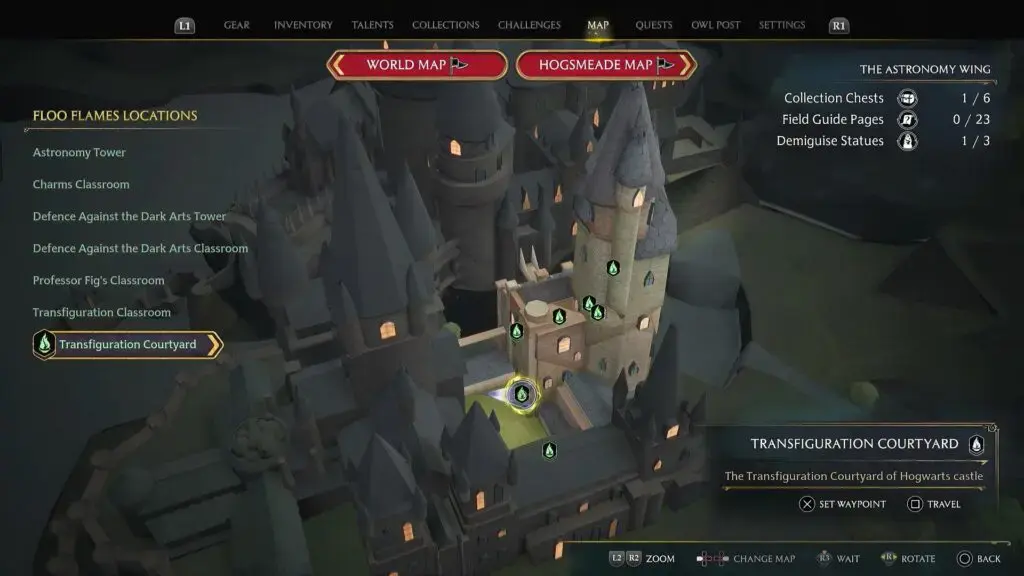 Transfiguration Courtyard Floo Flame 옆의 문을 통과하십시오. 그런 다음 아래 두 번째 그림과 같이 오른쪽에 있는 2단계 잠긴 문을 열면 조각상을 찾을 수 있습니다.