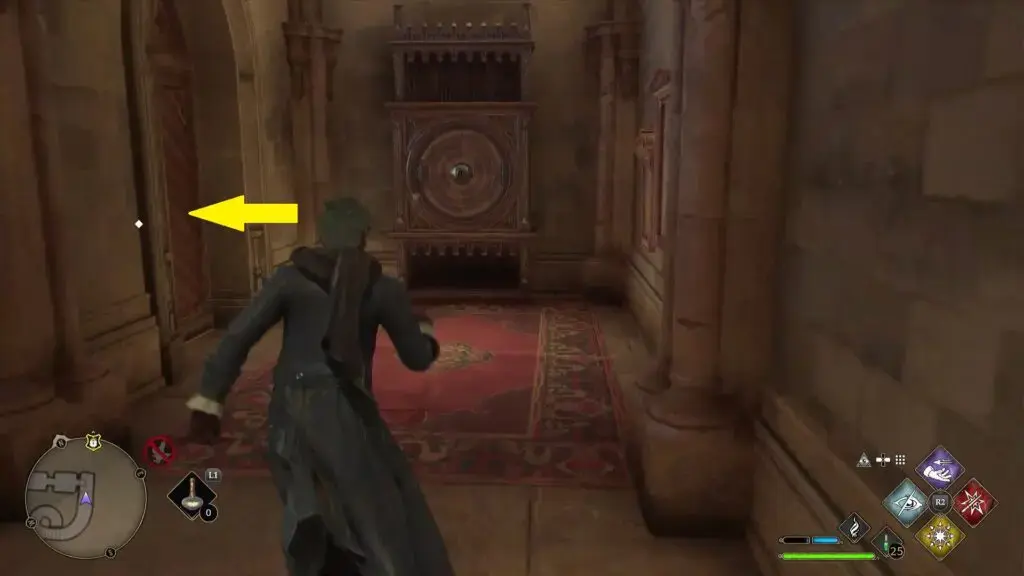 동상은 아래 그림과 같이 호그와트 북쪽 출구 근처의 1층 잠긴 문 뒤에 있습니다.