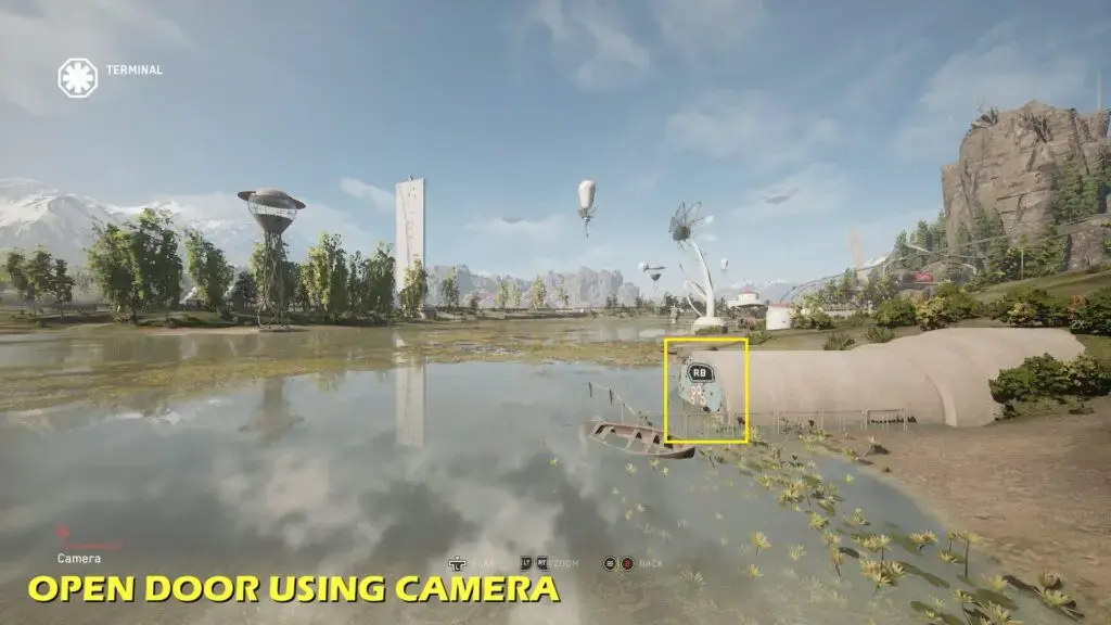 아래 그림에 표시된 위치로 이동하여 거기에 있는 작은 탑을 올라가면 볼란을 찾을 수 있습니다. Volan과 상호 작용하고 아래 사진에 표시된 카메라를 사용하여 아래 두 번째 사진에 표시된 출입문을 엽니다. 이제 안으로 들어가 엘리베이터를 타고 아래로 내려가 시험장에 도착합니다.