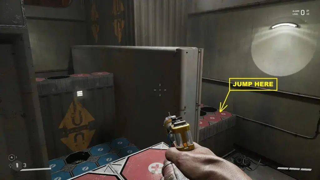 아래 그림과 같이 선반 위로 이동하여 1번 플랫폼으로 점프합니다. 그런 다음 지붕에 충격을 가하십시오. 이렇게 하면 플랫폼 #1 및 #2가 다운됩니다. 이제 2번 플랫폼으로 이동합니다. 다시 지붕에 충격을 가하여 플랫폼 #2를 위로 이동합니다. 그런 다음 앞에 있는 다른 자기 플랫폼으로 점프합니다.