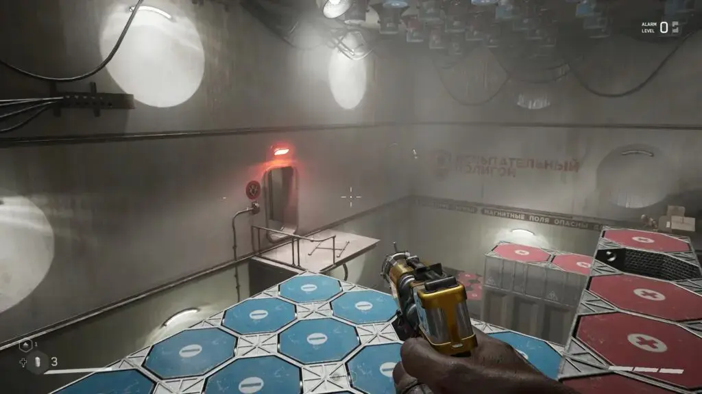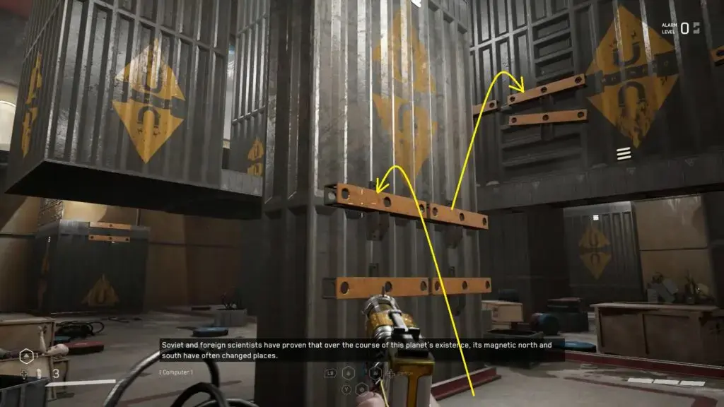 자기 문으로 돌아가서 충격을 사용하여 반대쪽으로 이동하십시오. 계속 진행하면 자석 퍼즐 방에 도착합니다. 아래 그림과 같이 자기 벽에 도달하기 위해 플랫폼에 점프합니다. 거기에서 아래 두 번째 그림과 같이 다른 플랫폼으로 점프합니다. 그곳의 벽과 상호 작용하여 레이저 퍼즐을 시작하세요. 이 퍼즐의 경우 아래 세 번째 그림과 같이 중심선을 녹색으로 만들고 다른 두 줄을 빨간색으로 만들어야 합니다. 퍼즐을 풀면 문이 열립니다. 지붕에서 충격을 사용하여 플랫폼 점프를 이동합니다. 이제 아래 네 번째 그림과 같이 플랫폼으로 점프하여 문에 도달합니다. 금 상자에 도달하기 위해 계속 진행하십시오. 열어서 KS-23 – Extended Magazine 및 ZVEZDOCHKA – Saw Dance를 받으세요.청사진. 이제 엘리베이터를 타고 정상으로 올라가 시험장을 빠져나갑니다.